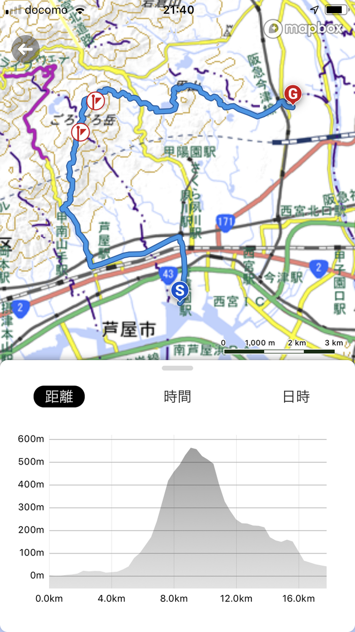 昼過ぎの帰りは病院から芦屋川駅までロードランニングで行き、芦屋川駅からゴロゴロ岳~観音山~鷲林寺~北山貯水池~甲山~仁川と自宅までトレイルランニングで計約17.5㎞を駆け抜けてきました。昼の12時30分ちょうどに病院を出発です。