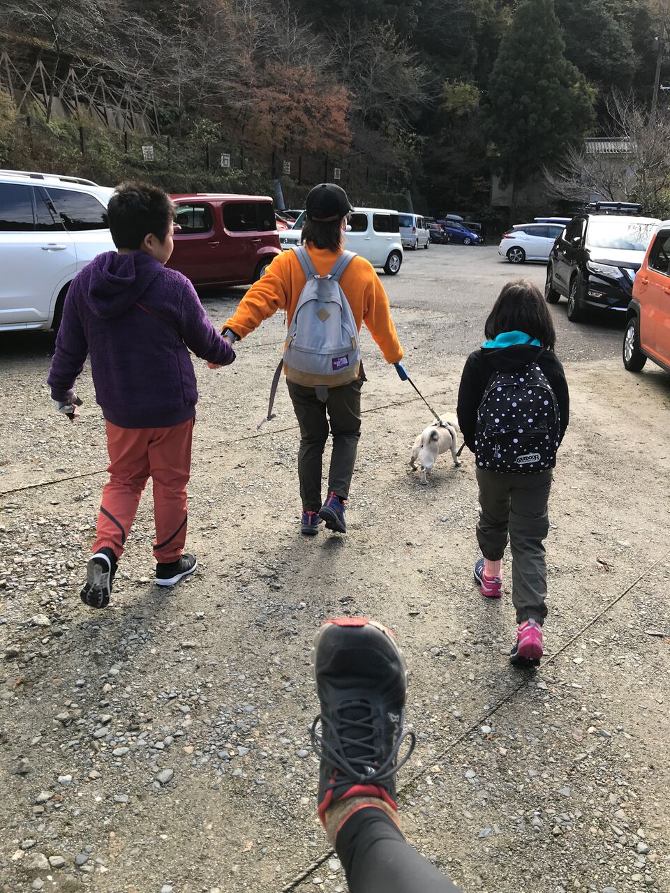 家族4人と愛犬と駐車場から出発です。