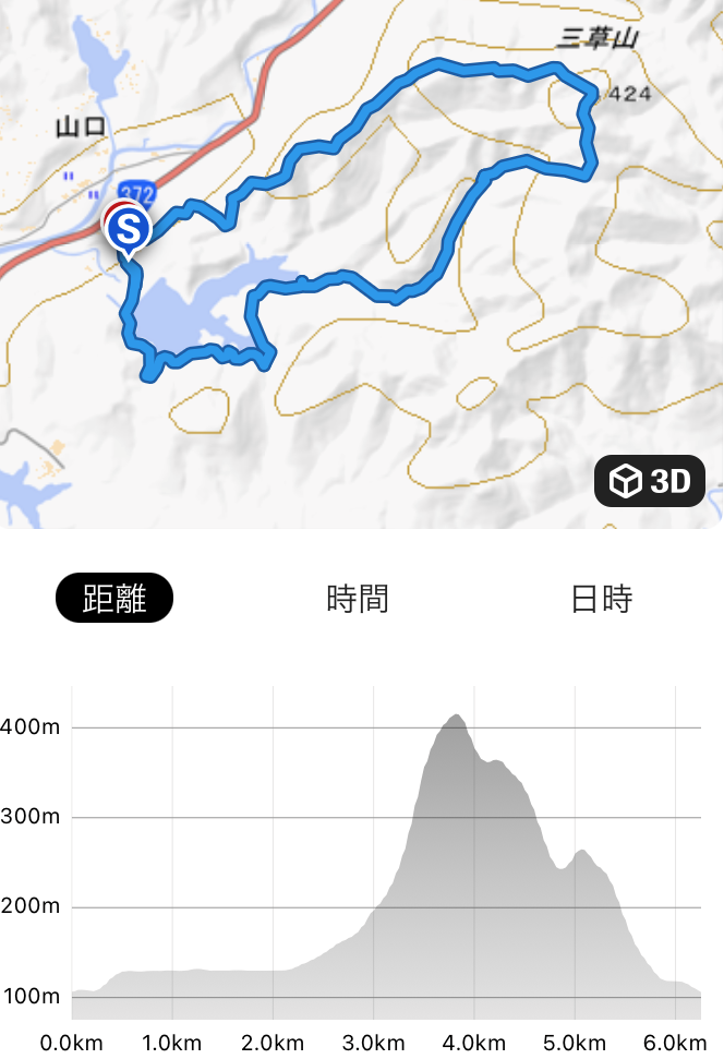 合計4時間36分(行動時間:3時間13分、合計休憩時間:1時間23分)、上り下り各365mでした。