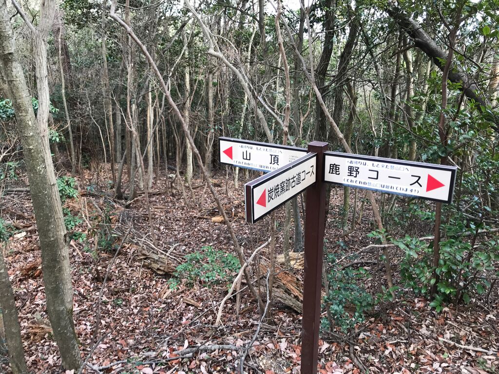 炭焼窯跡コースを登り切り、鹿野コースとの山頂付近の分岐点です。
