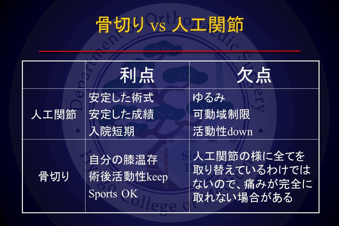 よって、スポーツや重労働を行う人に人工関節をしてしまうと活動が制限されてしまうので関節温存手術である骨切り術の適応となります。