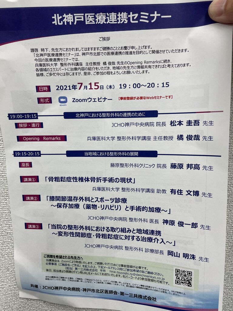 神戸中央病院の整形外科が一新されましたのでその紹介とお披露目を兼ねて地域の開業の先生方へ向けてお話させて頂きました。