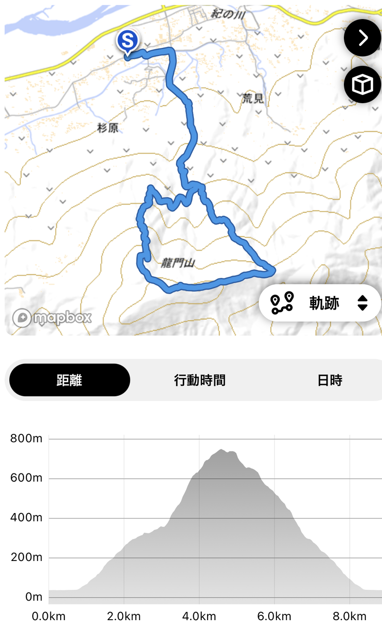 紀の川南の麓の駐車場を出てミカン畑の間を登り中央コースから登り、竜門山山頂から田代コースを下り(画面反時計回り)、再度駐車場までのコースでした。