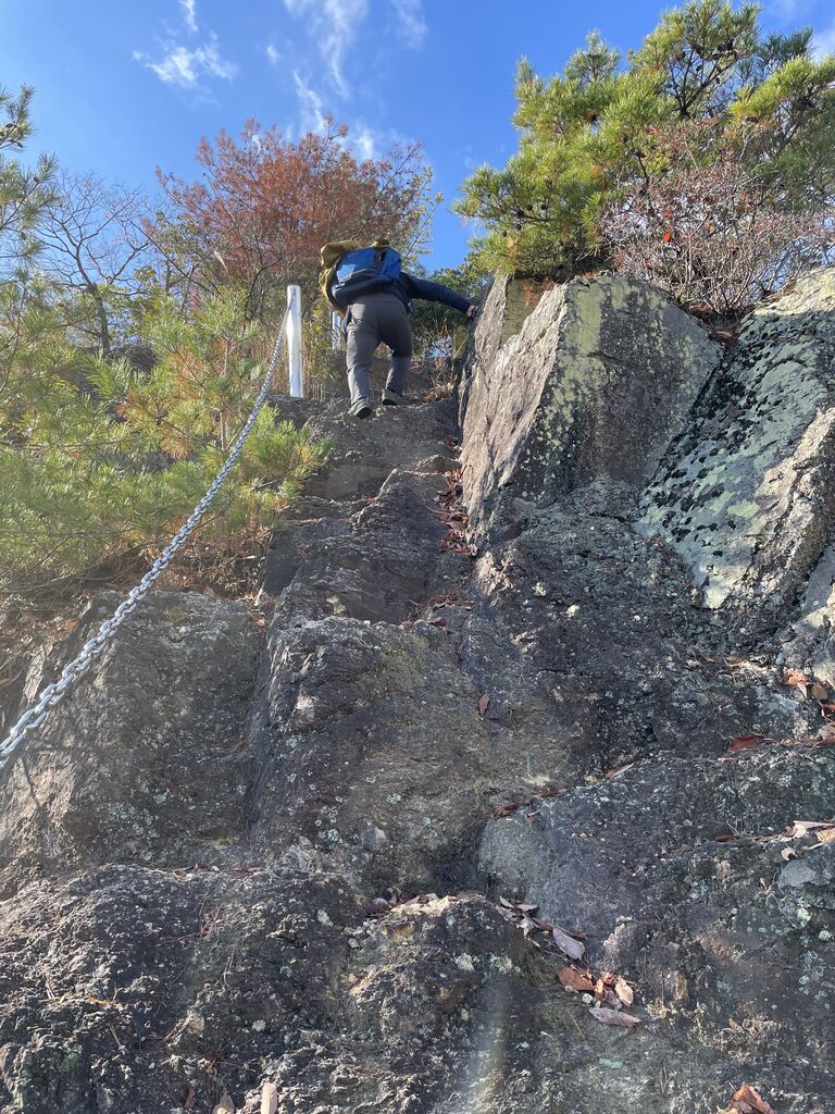 東の山頂上をすぐに後にして暫く下った後の登りを一部急な岩肌で鎖が整備されていました。