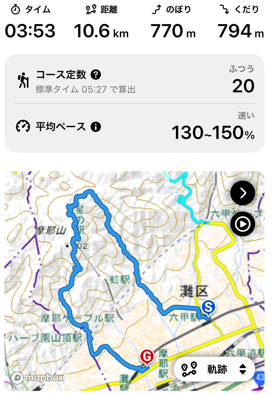 総距離10.6㎞ のぼり770mくだり794mでした。 3時間53分でした。